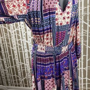 American Eagle Outfitters Boho Cold Shoulder Quilted Pattern Floral Dress. Features 3/4 length cold shoulder sleeves with elasticized cuffs and adjustable spaghetti straps, smocked elastic waistband, keyhole button closure on back, colorful mixed floral and geometric print in a quilted pattern in shades of blue, purple, red, yellow, maroon, cream, coral and black. Worn once with no flaws to note. See pics for measurements. This is a very cute and flattering little dress!