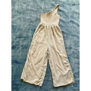 Pale goldenrod yellow wide leg jumpsuit with a cream colored floral pattern throughout. One shoulder super stretchy smocked bodice. Fully lined. Has pockets!