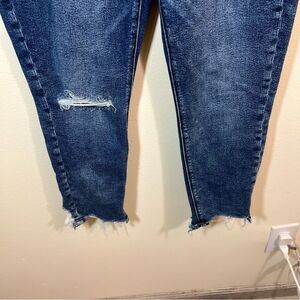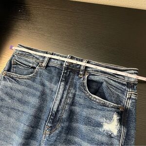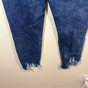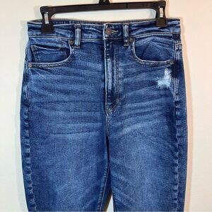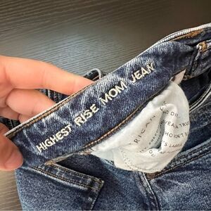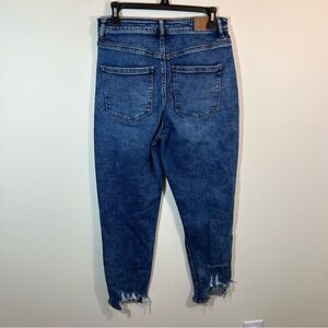 American Eagle women’s blue slightly distressed Highest Rise Mom jeans.