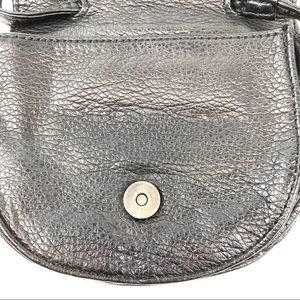 Black vegan leather bag. Magnetic snap closure. Mirror inside. Can expand a bit.