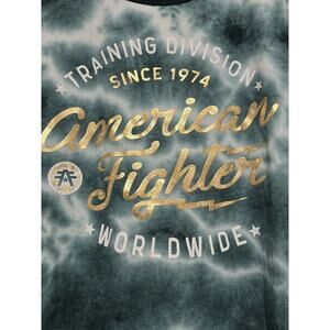 This is a women's green T-shirt by American Fighter, a brand affiliated with Affliction. The tee features a Tye Dye pattern with gold foil accents. It has a round neck, short sleeves, and a slim fit. Made of polyester and cotton, this backless shirt is lightweight and sheer, suitable for casual occasions. The design is inspired by hipster, biker, music, grunge, and metal themes, making it a stylish and edgy choice for a never-worn piece.