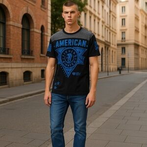 Experience the perfect blend of style and comfort with the American Fighter Black and Blue Short Sleeve Tee. This shirt features striking electric blue graphics on a deep black base, creating a bold and dynamic look. Ideal for casual outings or athletic activities, it offers a standard crew neck design for a classic fit. Excellent Like new condition