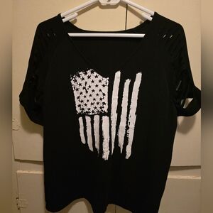 .Get ready to show off your patriotic side in this unique black v-neck tee. The front features a striking, distressed American flag graphic with white stars and stripes. The short sleeves have a cool "shredded" or cutout detail, giving it an edgy, lived-in feel. It's super soft and comfortable—perfect for a Fourth of July barbecue, Memorial Day, or any day you feel like celebrating.