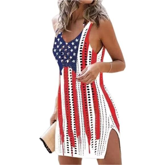 American Flag Dress Slit Crochet Sleeveless Tank Dress Swimwear Dresses
