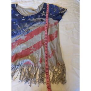 Stylish patriotic t-shirt featuring an American flag design with stars and stripes in red, "white" (beige/gray), and blue. The unique fringe bottom detail adds a boho-chic touch to this festive top.