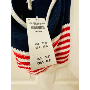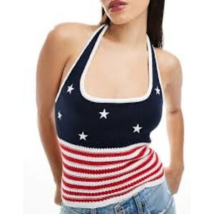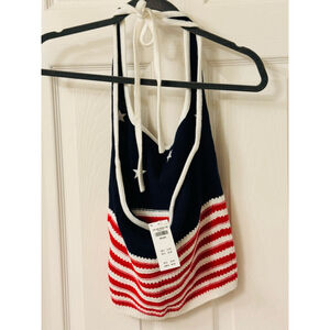 This is a Hollister halter top, new with tags. The top features a patriotic design with a navy blue upper section adorned with white stars, and a lower section with alternating red and white stripes. The neckline and armholes are trimmed with white. The top is made of a knitted material and has a tie closure at the neck. The size is medium.
