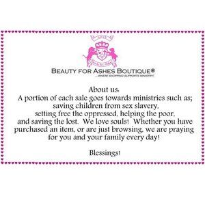 Please note: Beauty for Ashes Boutique carries t-shirts, worship flags, clothing, jewelry and accessories; many with our trademark brand name 'Beauty for Ashes' - which means God will restore Beauty in place of life's ashes - Isaiah 61:3. None of our items carry literal ashes. Instead, our items carry the blessings of God representing restoration and divine destiny for each individual.