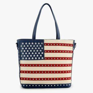 This attention-getting tote features "Old Glory" with star-shaped metal studs and sparkling rhinestones.