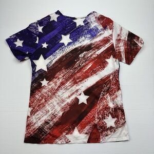 This American Flag shirt is a patriotic and stylish addition to any wardrobe. Made with lightweight material, this blouse features a printed flag design.