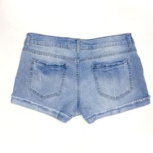 American flag blue jean denim light wash low rise shorts with american flag patchwork! ****There is some discoloration, seen in last photo***
