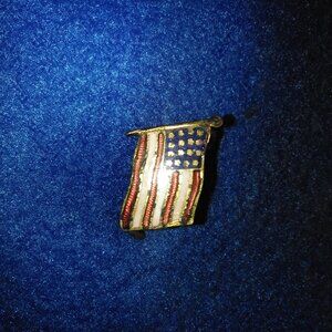 This listing for an American Flag Small Gold Tone Metal Painted Brooch Pin Red White Blue Colors