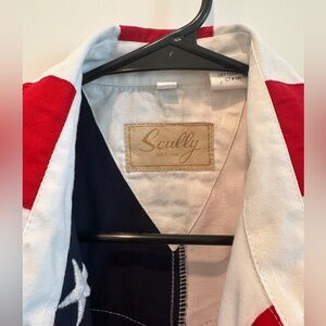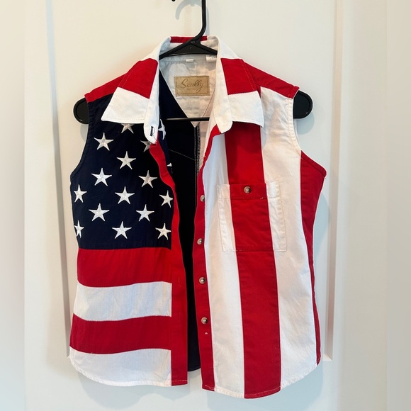 American flag vest, perfect for music festivals or Cowboy Carter! Short sleeves, button up, and 100% cotton. Slight discoloration on left side (pictured), barely noticeable.