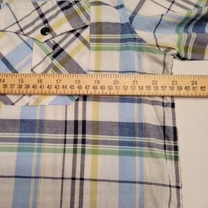 American Fusion Gear Mens Large Short Sleeve Shirt Blue Green Plaid Button Up