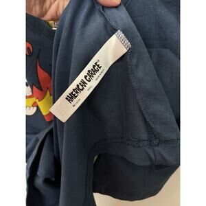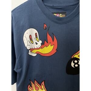 The product is a men's regular fit T-shirt by American Garage in size small, featuring a blue color with a theme of fire and skull design. Made of cotton, this shirt is a stylish and comfortable choice for those looking to express a bold and edgy aesthetic.