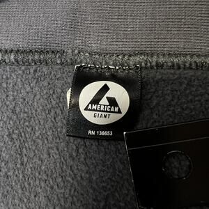 Branding details: American Giant logo patch at hem, quality tags throughout, branded zipper pull