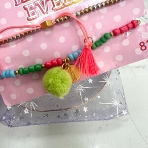 2-piece bff friendship bracelet set from American Girl, featuring beads, tassels, a heart charm, and a fuzzy green pom-pom. Designed for ages 8+, these stretchy bracelets are fun for mixing, matching, or gifting. Packaged on original “Best Friend Ever!” card.