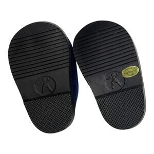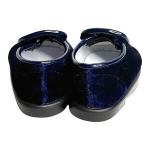 Dark blue "suede" shoes in velvet with faux patent leather trim. Black soles and heels.