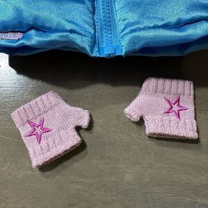- Light purple knit fingerless gloves. Dark pink logo star embroidered on back hand side of each.