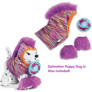 American Girl DALMATIAN PUPPY DOG + FUR-ROCIOUS PET OUTFIT Fur Hoodie Legwarmers - NEW Condition In Red Handled American Girl Bag