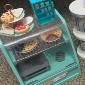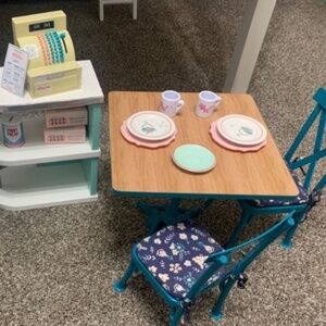 LIKE NEW! American Girl Doll Bakery Set and Dining Set. There are 32 pieces total. Dining room set has table, 2 chairs, plates and cups. Bakery Set includes display case with lots of food items and bakery accessories and cash register stand with little menu and bakery boxes accessories. Super cute! Smoke free home!