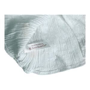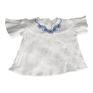 • Blouse: White, loosely worn peasant-style yoked blouse. Fabric is pleated to a crinkle. Short bell sleeves. Blue and bronze embroidery on the front yoke.