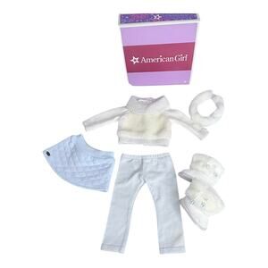 • Adorable American Girl winter outfit featuring a cozy white sweater paired with a light blue quilted skirt and matching leggings. The set is completed with soft white winter boots and a coordinating fuzzy headband. Includes the original American Girl box, making it great for collectors or display.