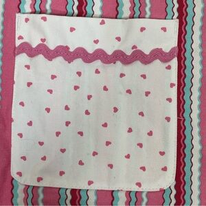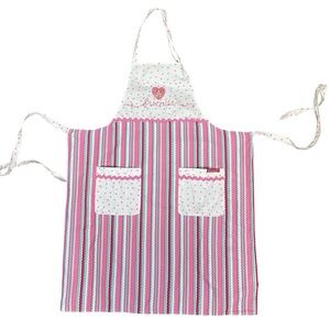 American Girl Girl's Apron. Top is whote with pink hearts and an embroidered heart and "Friends" text. Skirt of apron is wavy striped. Two patch pockets. Apron ties in back. Adjustable neck. Charming! Preowned, good condition!