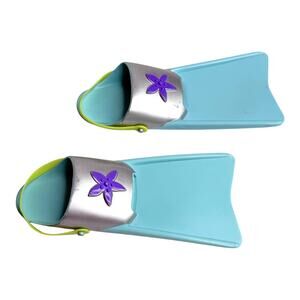 • Fins: Aqua rubber fins with silver foot cups, lavender starfish accents, and green flexible straps. Straps can be removed to put fins on doll.
