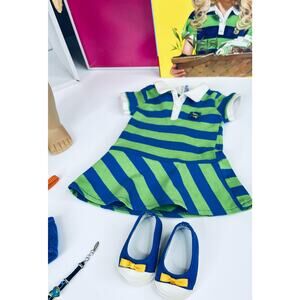 •Lanie Will Arrive To You In Her Original Meet Outfit: Her Dress Is Blue And Green striped short sleeved rugby dress. Knee length. White polo style collar. White sleeved cuffs. Embroidered patch on left chest showing two dragonflies. Three non-functional white buttons on collar placket. A Double-Ribbon Blue Headband With A Yellow Felt Dragonfly Applique With Blue Stitching. Blue & White Canvas Shoes With Yellow Bows On Toe, Dark Blue Underwear Panties With White Embroidered Dragonfly.