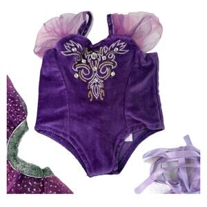 •Leotard: A purple velour leotard with shirred tulle sleeves that has a metallic embroidery and rhinestone decoration on the bodice.