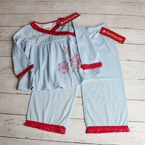 This lot includes 2 two-piece pajama sets perfect for twin girls. Each set includes a long-sleeve pajama top and coordinating pajama pants. They are light blue with pink satin ruffle trim and snowflakes. These are authentic American Girl brand and both sets are brand new with tags.