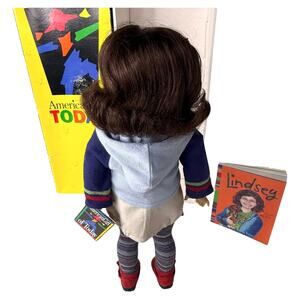 Lindsey Arrives In Excellent Condition In Her American Girl Today Box (shows wear consistent with 18yrs age) Dressed In Her Original Meet Outfit: A Bobby Pin With Red Seed Beads Threaded Into It, DOGS T-Shirt, Blue Hoodie, Khaki Skirt, Tights, Red Boots And White Underwear. She Also Comes With Her Paperback "Lindsey" Meet Book!