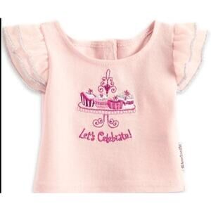 Doll Size Party Tee: Pink Tee Embroidered With Cupcakes Pastries & "Let's Celebrate" On Front, Tulle Ruffles At Sleeve And Velcro Back