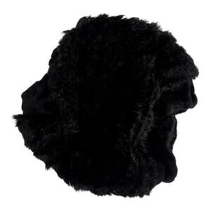 • Coat: Black faux-fur coat. Black satin belt attached with black glossy buttons. Two black glossy buttons on left side up. Black faux-fur velvet trim on cuffs and collar.