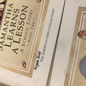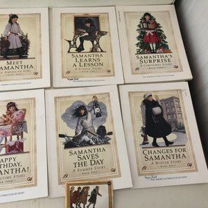 American Girl Samantha doll (retired), original meet dress, dolly + nutcracker, Meet hat, books 1-6. The doll's legs are a little loose but she can stand on her own if placed carefully, otherwise in great condition. Dress, Dolly and hat are in very condition (see photos). Books are in fair and used condition, with cover scuffs and some have writing on them (see photos).