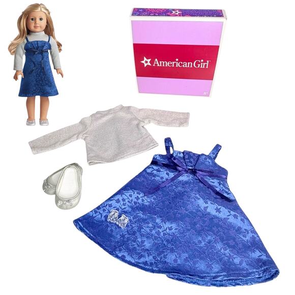 American Girl Sapphire Party Outfit Blue Dress Silver Shoes Sweater Hair Clips Retired - NEW Condition In Box!
