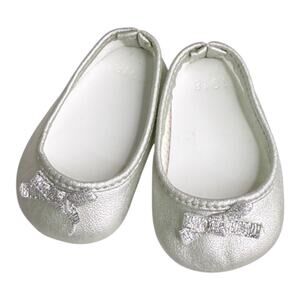 • Shoes: Silver slip on flats with metallic bows at toe.