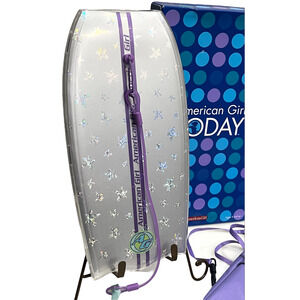 Boogie Board: Silver boogie board decorated in silver metallic starfish design and purple accents. Two purple stripes with "American Girl" in running pattern down the middle of stripes. Blue, purple, and green AG logo at bottom of board. Logo matches the one on Kailey's board bag, wet suit, and camera. Pattern is identical on both sides of board. Clear plastic shell covers whole board. A version of this board is on the cover of Kailey. However, the cover board does not have "American Girl" written on it.