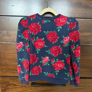 Style blooms with vivid red roses and puff sleeves on this soft French terry top. Perfect for fall, the holidays, or Valentine’s Day.