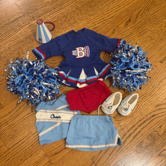 Adorable and authentic American Girl cheer outfits and accessories. Item includes 2 outfits, set of shoes, pots and megaphone. They are in excellent condition!