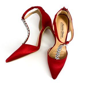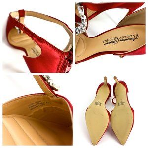 American Glamour Badgley Mischka Heels are satin stiletto heels with diamond rhinestone embellishments. These heels are quite stylish and elegant which you can style for both casual and formal wear. Style with silk blouses, tuxedo pants, or skirts.