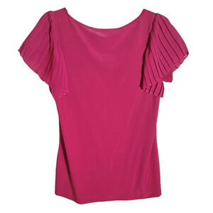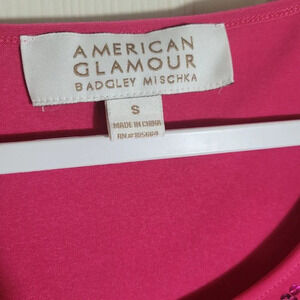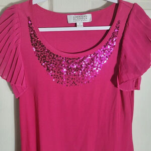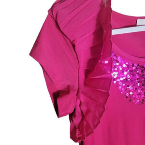 American Glamour Badgley Mischka Sequin Flutter Sleeve Blouse. Barbie. Valentines Day. Women's size Small. Color is Dark Pink. Pleated Flutter Sleeve, and Sequin Neckline Details. Good pre-owned condition.