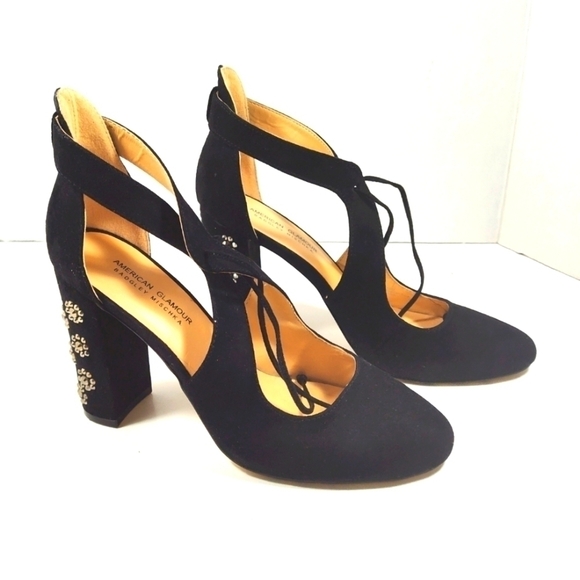 American Glamour beaded chunky heels suede black shoes Size: 8