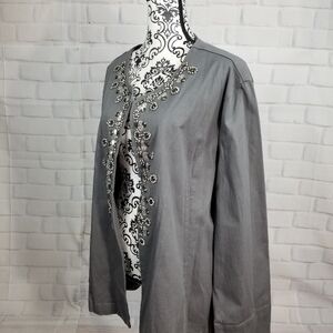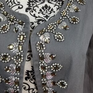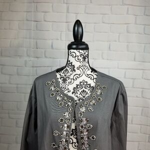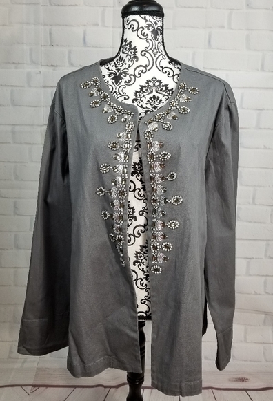 This is a women's long sleeve beaded open front jacket that comes in a plus size 3x stretch and is made by American Glamour.