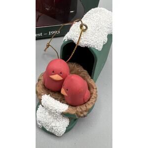 American Greeting Cards ornament "A New Nest" two red birds nesting a mailbox. measure 2 inches. It was made in 1993. Refer to photos for details.
