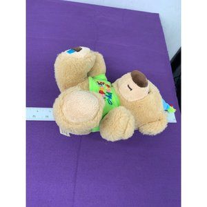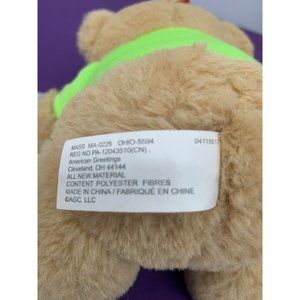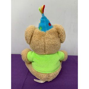 Charming 9 inch American greetings birthday bear. Tan bear with blue dot hat and green shirt that says "happy birthday". Foot features an embroidered cupcake. Perfect for birthday gifts.