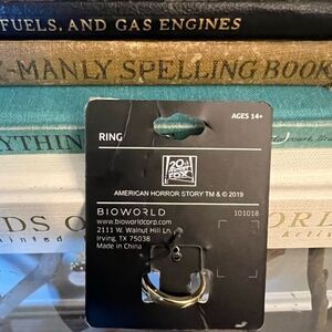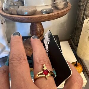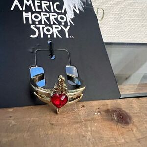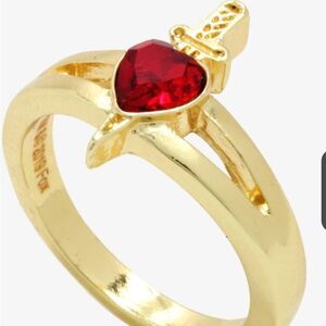 This gold tone ring from American Horror Story features a sword going through a red CZ gem heart.