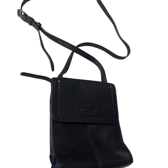 A sleek and functional black crossbody bag by American Leather Co. crafted from genuine leather. Features an adjustable strap, multiple compartments, and a secure design for everyday essentials.