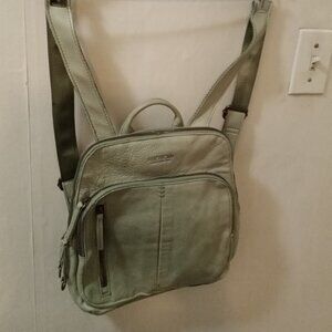 The American Leather Co. Cleveland Backpack in green sage is a medium-sized backpack made from smooth and buttery soft leather. It features a solid pattern with a zip closure and sage green leather handles/straps. This stylish backpack is designed for women and is the perfect blend of practicality and sophistication. The American Leather Co. Cleveland brand ensures quality craftsmanship and timeless style, making it a versatile accessory for everyday use.