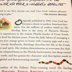 Cross Creek, a memoir by Marjorie Kinnan Rollins, originally published in 1942. This is a 1996 first touchstone edition paperback in good, clean, used condition with some rubbing at corners and spine, see examples. Also please note close up, last photo, of small stain on top of last few pages, doesn't affect any reading text. This is the story of the author's experiences in the remote Florida hamlet of Cross Creek. "A most delightful and heartwarming memoir."